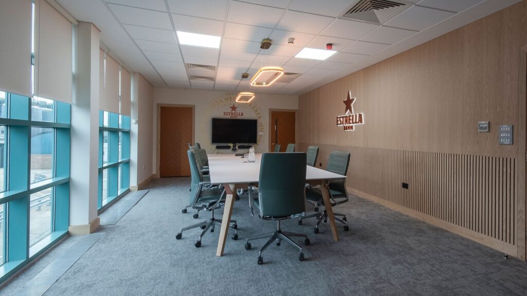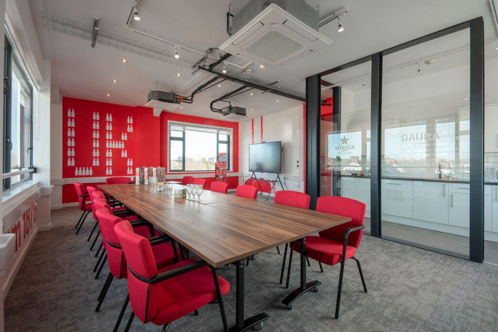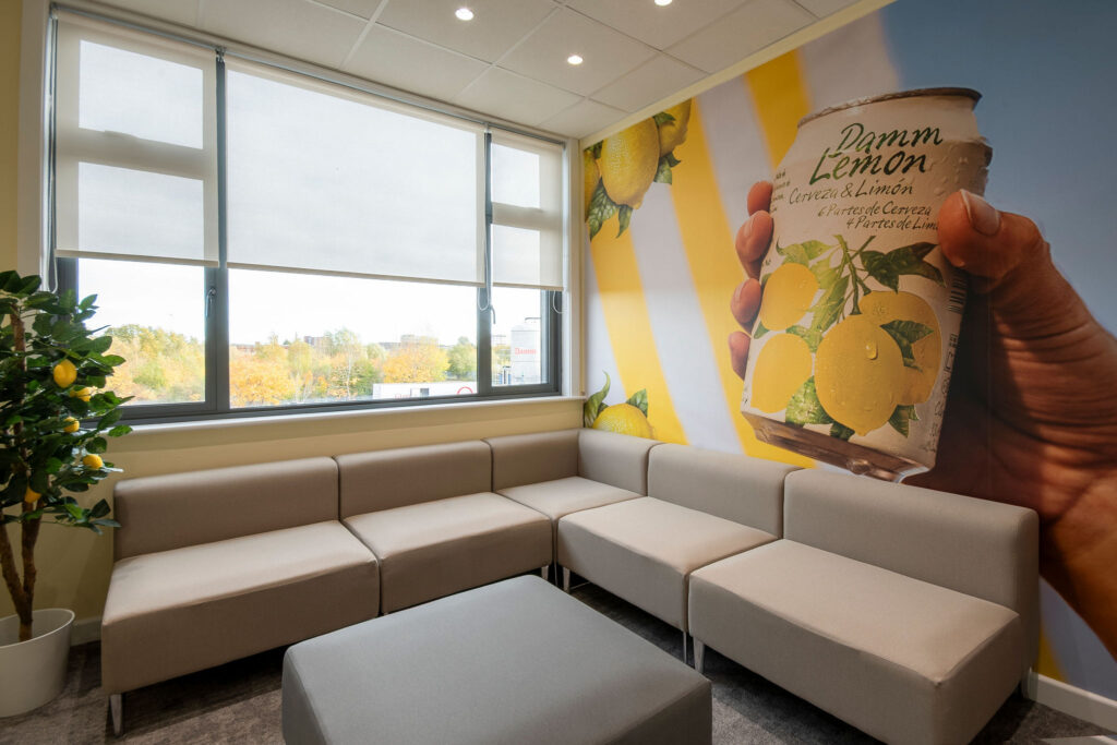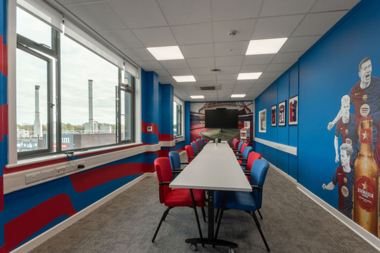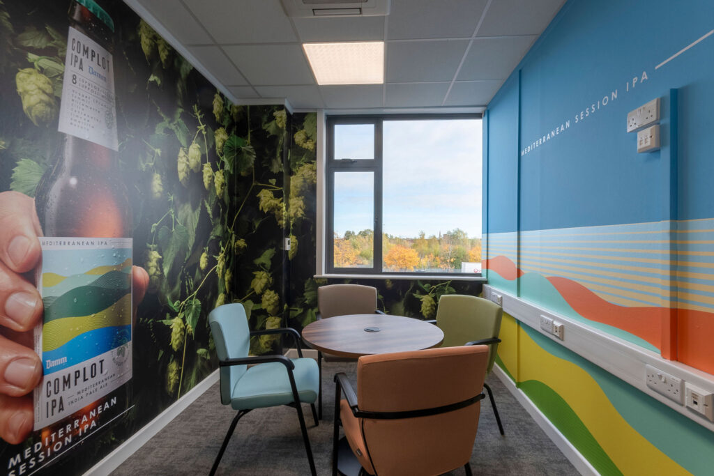 Each meeting room on the second floor was individually themed, reflecting DAMM’s own brands and their partner brands through distinct colour schemes and bespoke wall graphics.